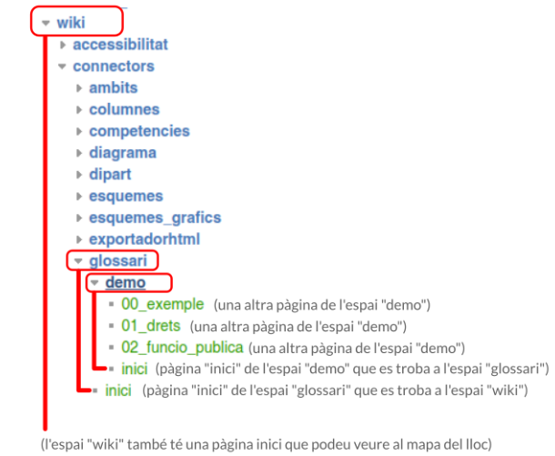 Al wiki cada espai/carpeta (de color blau), té com a mínim una pàgina "inici" (de color verd), però també es poden tenir d'altres pàgines (que també es representen de color verd)