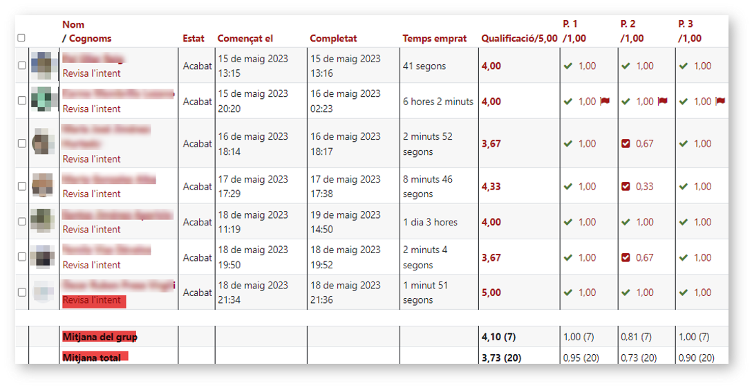 Si voleu veure el detall d'un alumne concret, només heu de fer clic sobre l'opció Revisa l'intent de… que veureu a la columna amb el nom i cognoms de cada alumne.