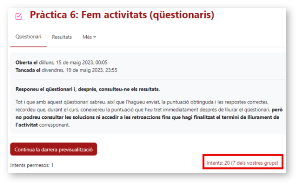 Per fer-ho, només heu d'accedir al qüestionari concret. Hi sortirà la indicació de tots els Intents que s'han fet (quants alumnes han respost) i podreu fer clic sobre aquesta opció.