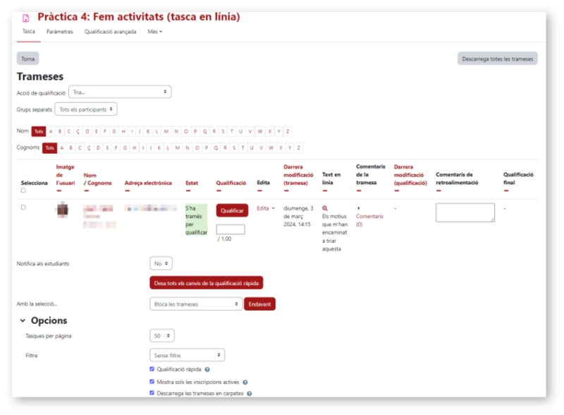 En fer clic sobre el botó Qualificació, es mostrarà la tramesa del primer dels alumnes i permetrà avaluar-ho, afegint-hi una qualificació i els comentaris o retroacció que convingui. Per tal de qualificar d'aquesta manera les trameses de l'alumnat cal seguir els passos següents: